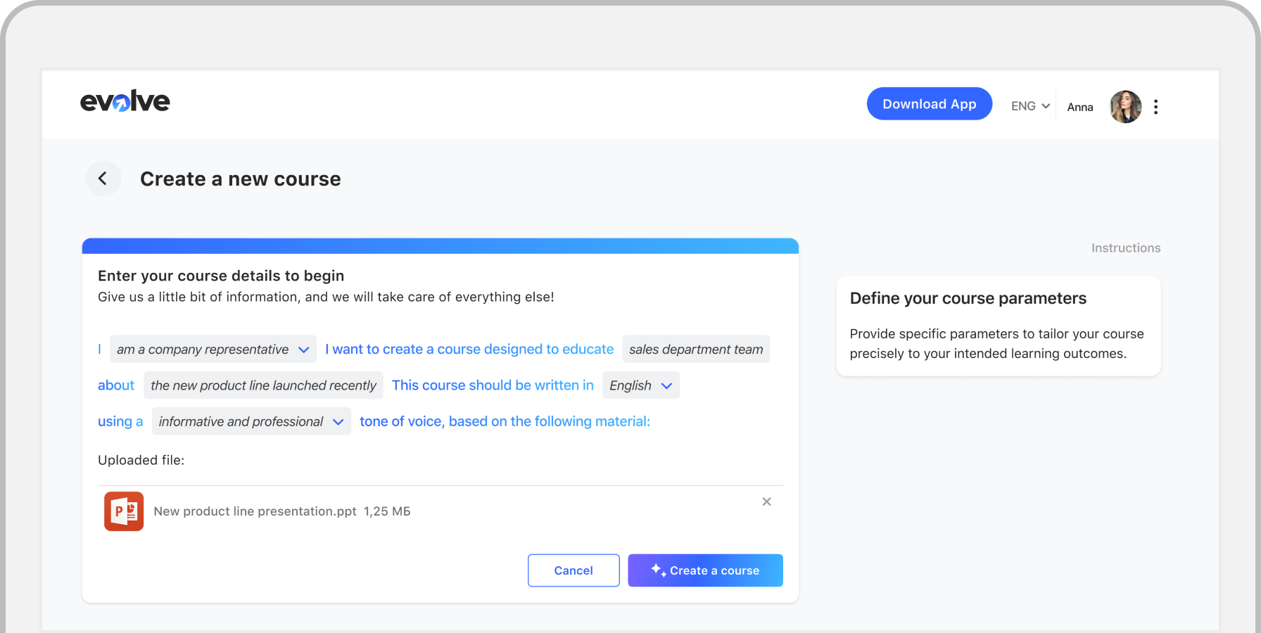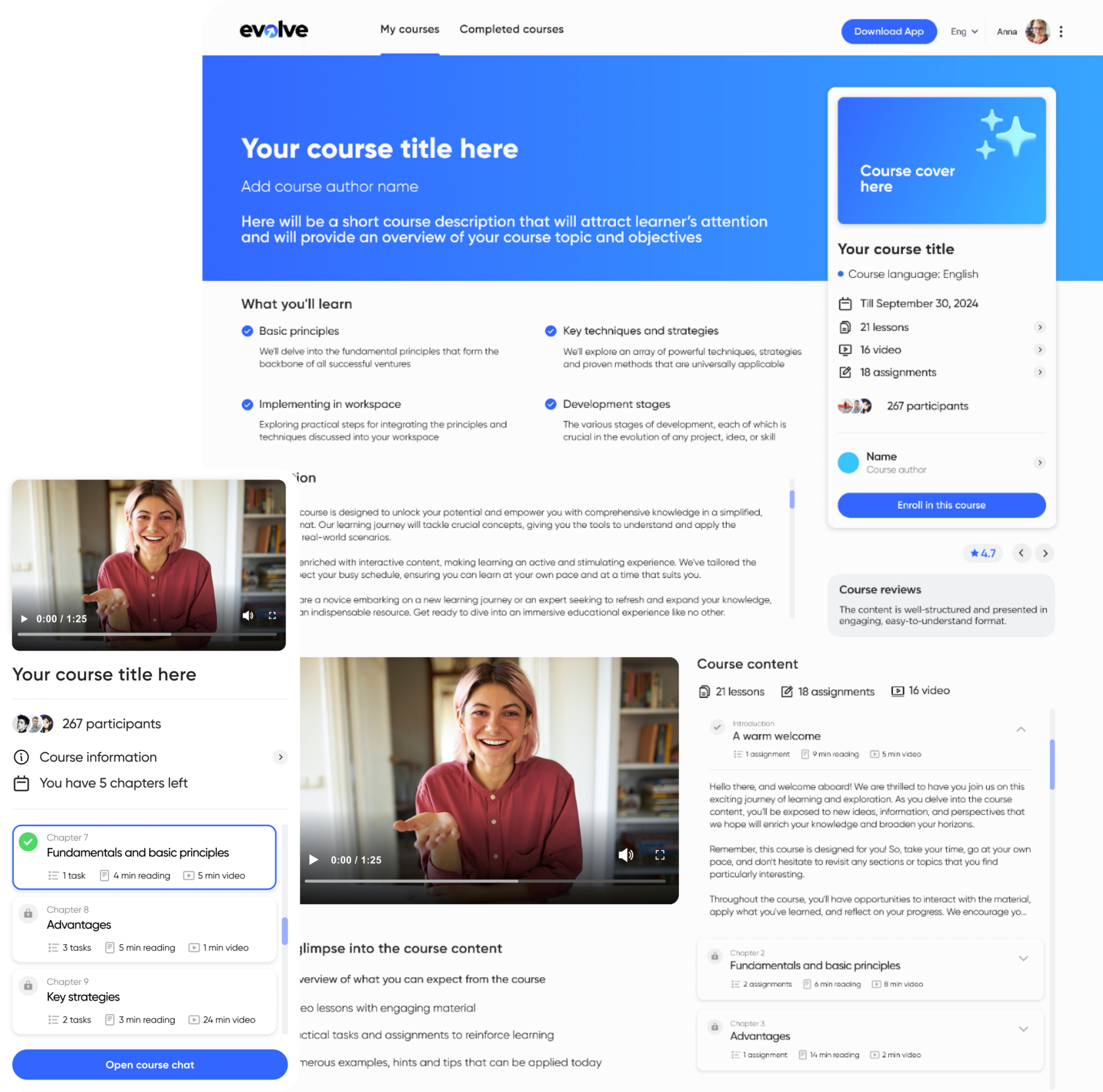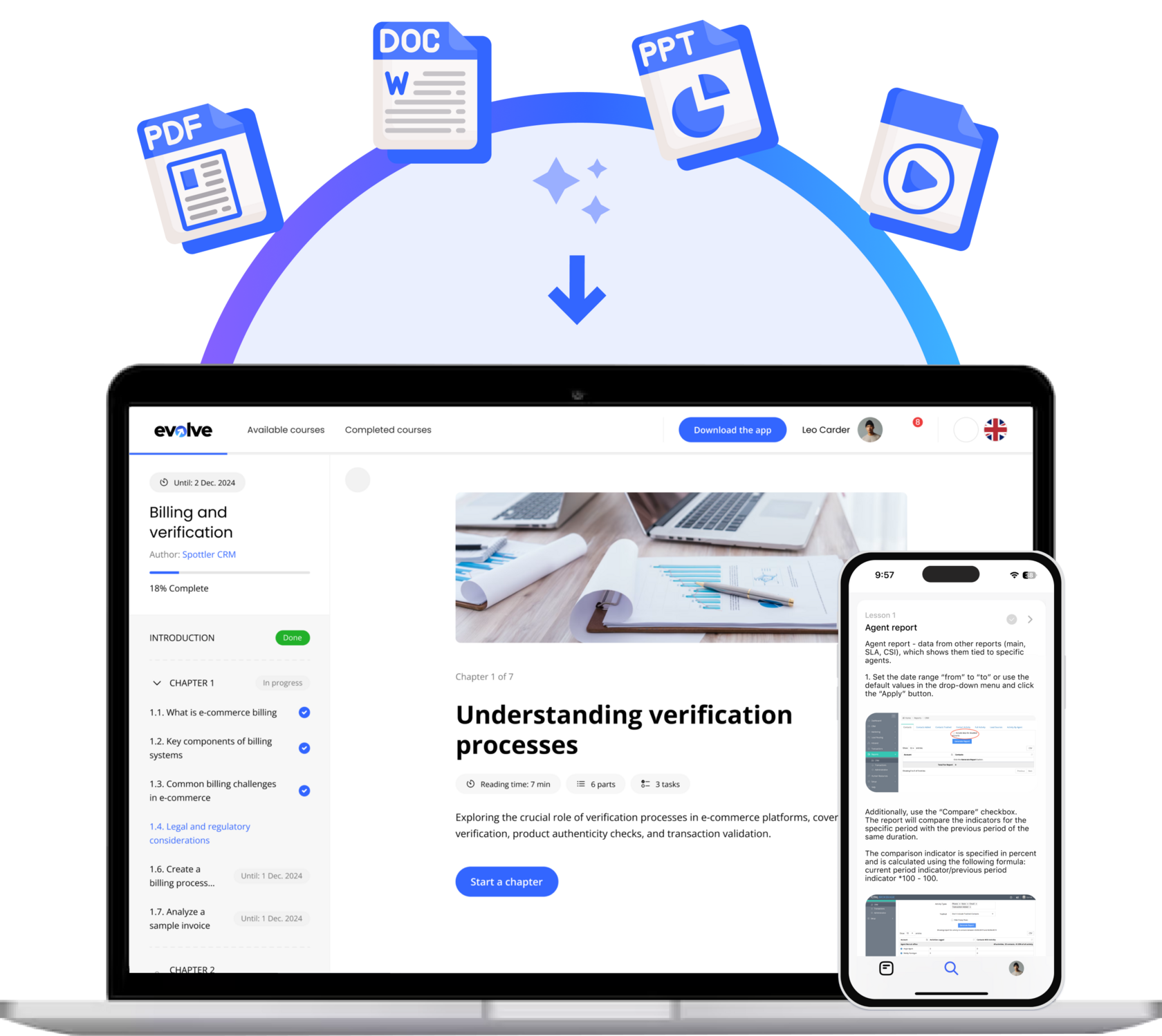 Evolve converts your materials into interactive trainings, integrating assignments, videos, real-world examples and cases for a tailored educational experience, while staying true to the original document